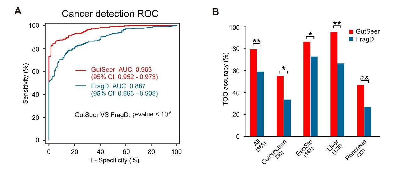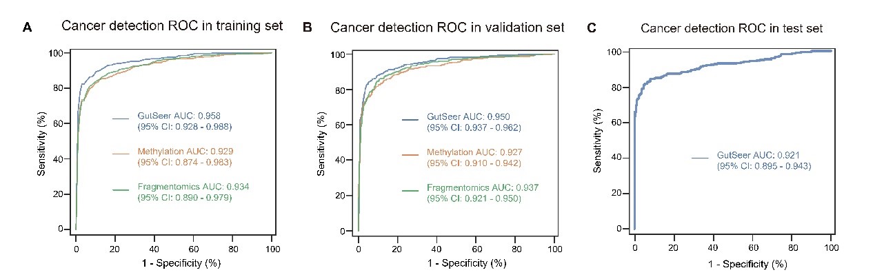 GutSeer®模型使用了1237个血浆样本的数据开发而成,包括529个癌症样本(63.3%为I/II期;335/529例)和年龄匹配的708个非癌症样本。在训练集中,GutSeer®模型的平均AUC为0.958,灵敏度为83.7%,特异性为95.8%(图2A)。模型的稳健性进一步在验证集中得到验证,保持了82.8%的灵敏度和95.8%的特异性,AUC为0.950(图2B)。另外,GutSeer®模型在组织溯源上表现出稳健准确性。模型在训练集中实现组织溯源准确性为83.7%,在验证集中为82.4%。准确的组织溯源性能提升了GutSeer®的临床实用性,为指导后续确诊流程和治疗计划提供了宝贵线索。