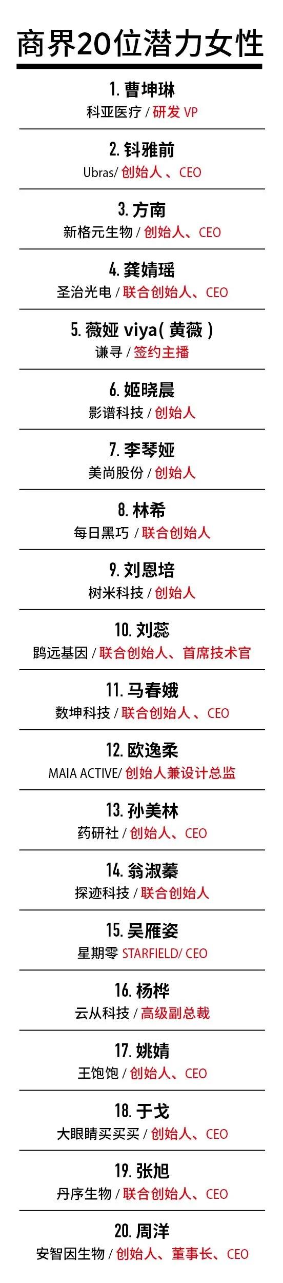 “福布斯中国2021商界潜力女性榜”是福布斯依据创业女性所在企业的营运质量、成长潜力以及公众影响力等维度进行评选,最终20位具有潜力的商界女性登榜,详细榜单如下。