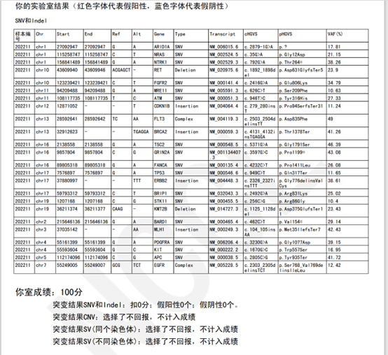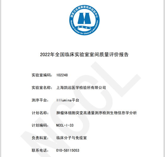 在今年6月份国家卫生健康委临检中心(National Center for Clinical Laboratories,NCCL)组织的肿瘤体细胞突变高通量测序检测生物信息学分析考核中,鹍远医学检验所亦以满分成绩通过考核。
