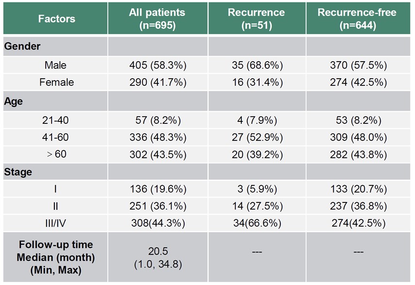 ok138太阳集团联合中国医学科学院肿瘤医院、中山大学肿瘤防治中心、四川大学华西医院、哈尔滨医科大学附属第二医院、中国医学科学院肿瘤医院深圳医院、长海医院、山西省肿瘤医院等单位,开展了一项大型前瞻性多中心队列研究(Protector-C研究),旨在为结直肠癌患者术后监测(微小残留病灶(MRD)检测)提供临床支持。本次大会公布了研究的中期分析结果。在 2022年7月至 2024年6月期间,共纳入了805名未曾接受过治疗的结直肠癌患者,这些患者均接受了R0切除手术,并且有至少10个月的随访时间。其中,695名患者完成了完整的POM1 ctDNA检测(中位随访时间:20.5个月;51例复发)(表1)。超过一半的入组患者处于早期阶段,包括136例I期(19.6%)和251例II期(36.1%)。在基线检查时,常艾克的检测灵敏度明显高于CEA。大多数患者的POM1 ctDNA水平显著下降,表明肿瘤负荷发生了动态变化。POM1时ctDNA阳性与较短的无病生存期(DFS)显著相关(P<0.001)。此外,术前和术后均保持ctDNA阳性的患者(双阳性)复发风险显著高于术前和术后均保持ctDNA阴性的患者(P<0.001)。此次中期分析证实了常艾克能较敏感地检出MRD,且在复发风险分层方面具有临床有效性。