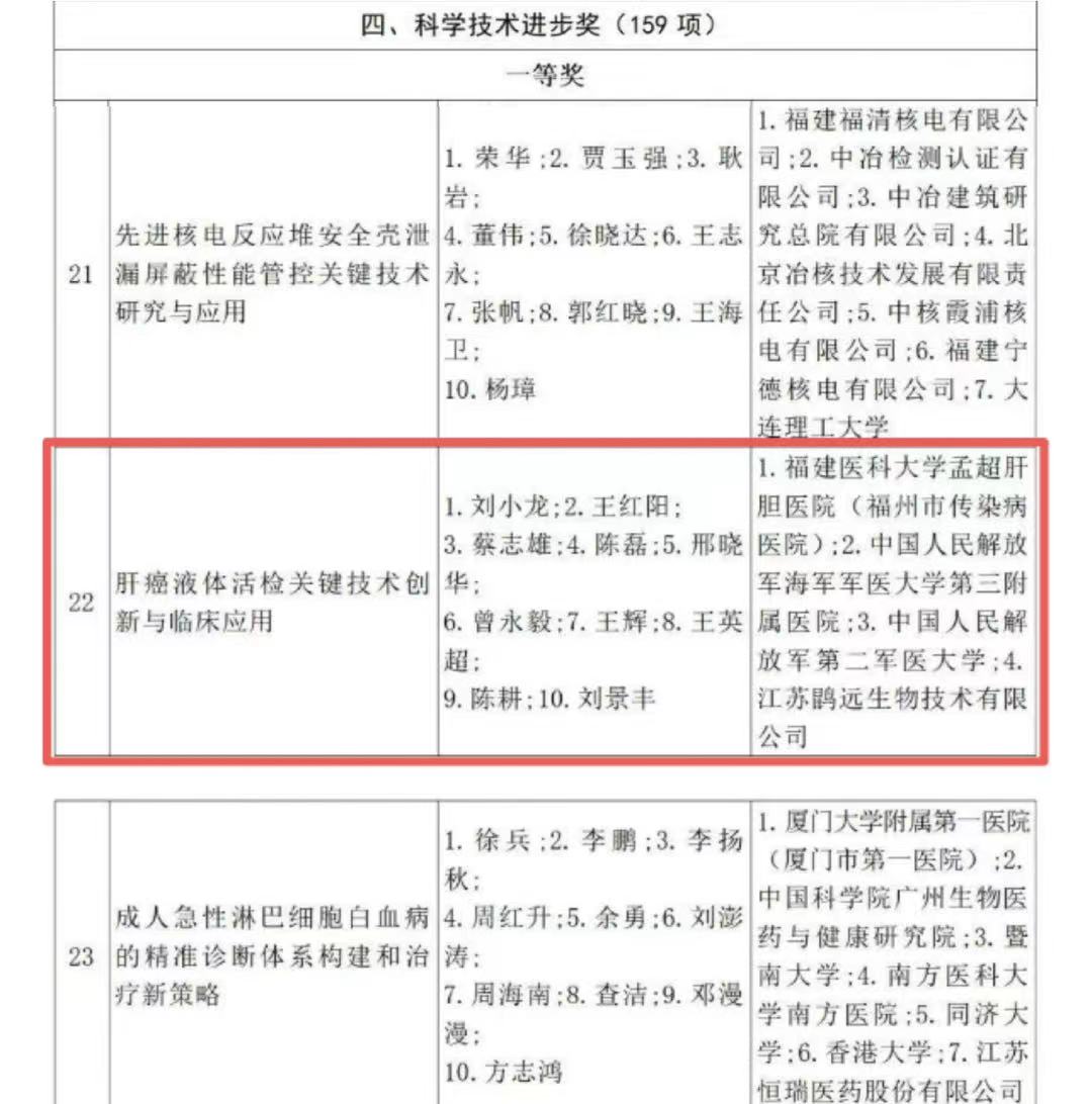 近日,福建省人民政府发布2024年度福建省科学技术奖获奖名单。由福建医科大学孟超肝胆医院刘小龙教授牵头,联合中国人民解放军海军军医大学第三附属医院、中国人民解放军第二军医大学与ok138太阳集团等单位科研团队共同完成的科技成果——《肝癌液体活检关键技术创新与临床应用》荣获福建省科技进步奖一等奖。该奖项标志着ok138太阳集团在肝癌早期检测领域的科研实力与技术转化能力获得高度认可。